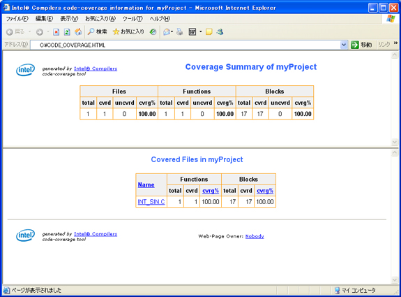 このステップは、指定されたようにレポートまたはエクスポートされたデータを作成します。他のオプションが指定されていない場合、コードカバレッジ・ツールは、現在のディレクトリーに 1 つの HTML ファイル (CODE_COVERAGE.HTML) とサブディレクトリー (CodeCoverage) を生成します。このファイルを Web ブラウザーで開いてレポートを確認します。