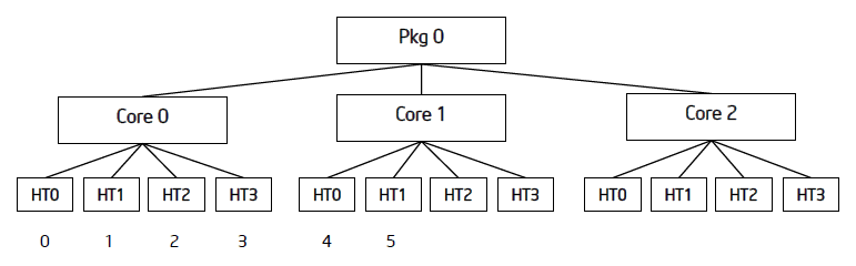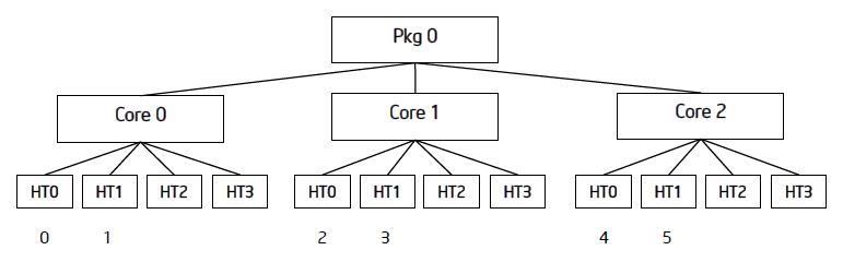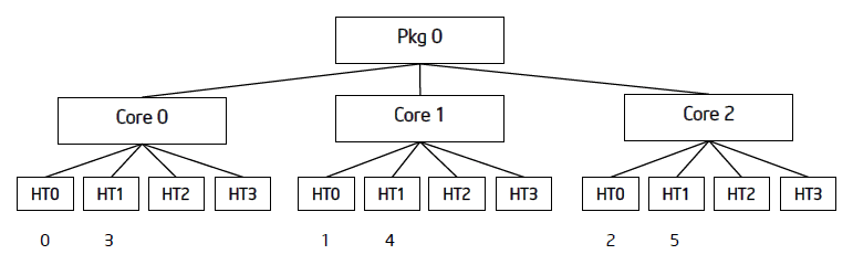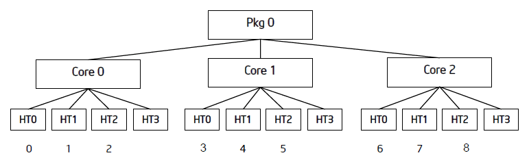 この設定では、scatter 型と同様に、OpenMP* ランタイムは、すべてのコアに少なくとも 1 つのスレッドが配置されるまで、別のコアにスレッドを配置します。 ただし、ランタイムが同じコアで複数のハードウェア・スレッド・コンテキストを使用する際、balanced 型では OpenMP* スレッドの番号が互いに隣接していることが保証されるのに対して、scatter 型では保証されません。