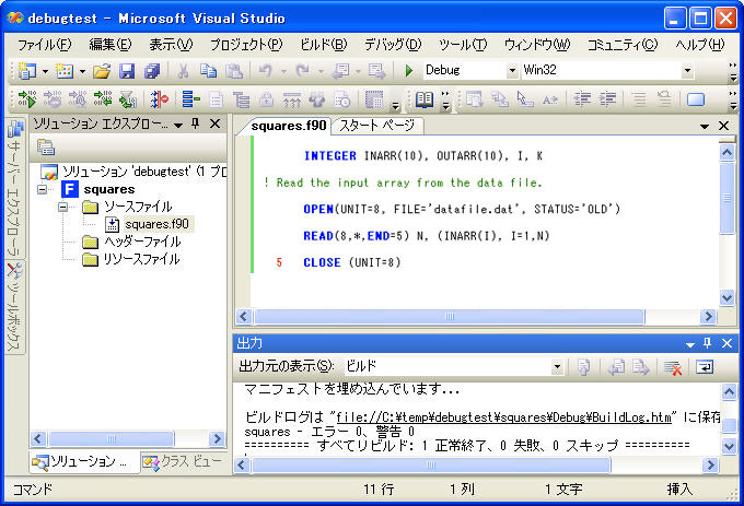 デバッグの対象となるソースファイルを表示するには、そのファイル名をダブルクリックします。 次のような画面が表示されます。